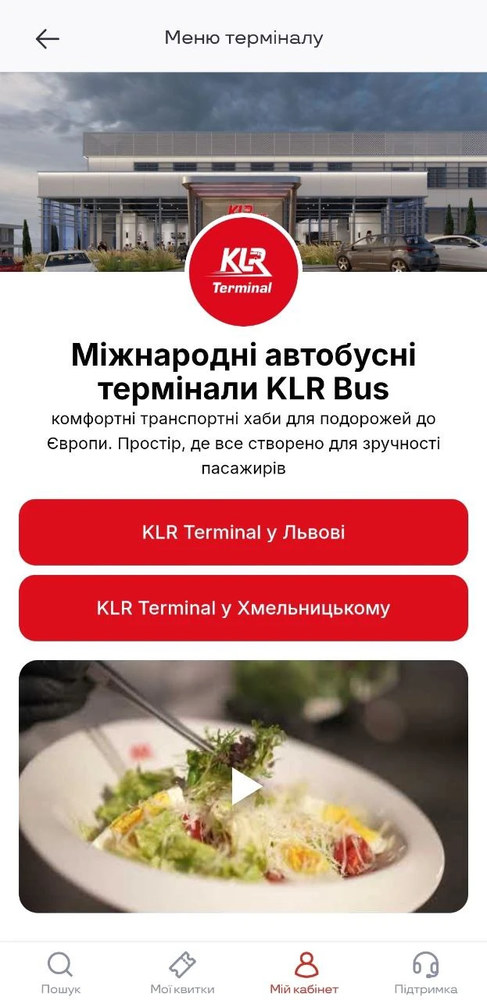 Для тих, хто цінує свій час та любить тримати все під контролем, KLR Bus інтегрував цю функцію у свій мобільний застосунок. Інтерфейс розроблений інтуїтивно зрозуміло, тож знайти потрібний розділ зможе навіть недосвідчений користувач смартфона. Щоб переглянути, чим можна поласувати на терміналі, виконайте прості дії: