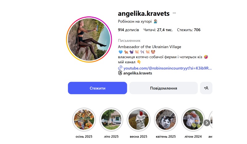 Анжеліка Кравець мешкає на Хуторі Лисички Тернопільська область. Тут немає магазинів, аптек чи стабільного інтернету, але є спокій, простір і час на себе. Удень вона доглядає господарство, а ввечері створює контент, який переглядають тисячі підписників. Її називають “Робінзоном на хуторі” і це визначення точно передає стиль її життя.